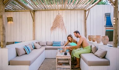 On y prend le petit-déjeuner, un cocktail en fin de journée, ou un dîner face au coucher de soleil, dans une ambiance détendue et colorée.